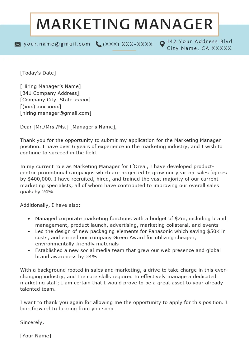This section should be at the top of your cover letter, clearly displayed and easily accessible. It should include your full name, address, phone number, and a professional email address. Your email address should be something simple and professional, such as your first and last name. The goal is to ensure the hiring manager can quickly contact you. Double-check all contact details for accuracy. Incorrect information, even a small typo, can be detrimental to your application, as it prevents the employer from reaching you. A well-formatted and accurate contact section is the first step in making a positive impression and showing the recruiter that you pay attention to detail.